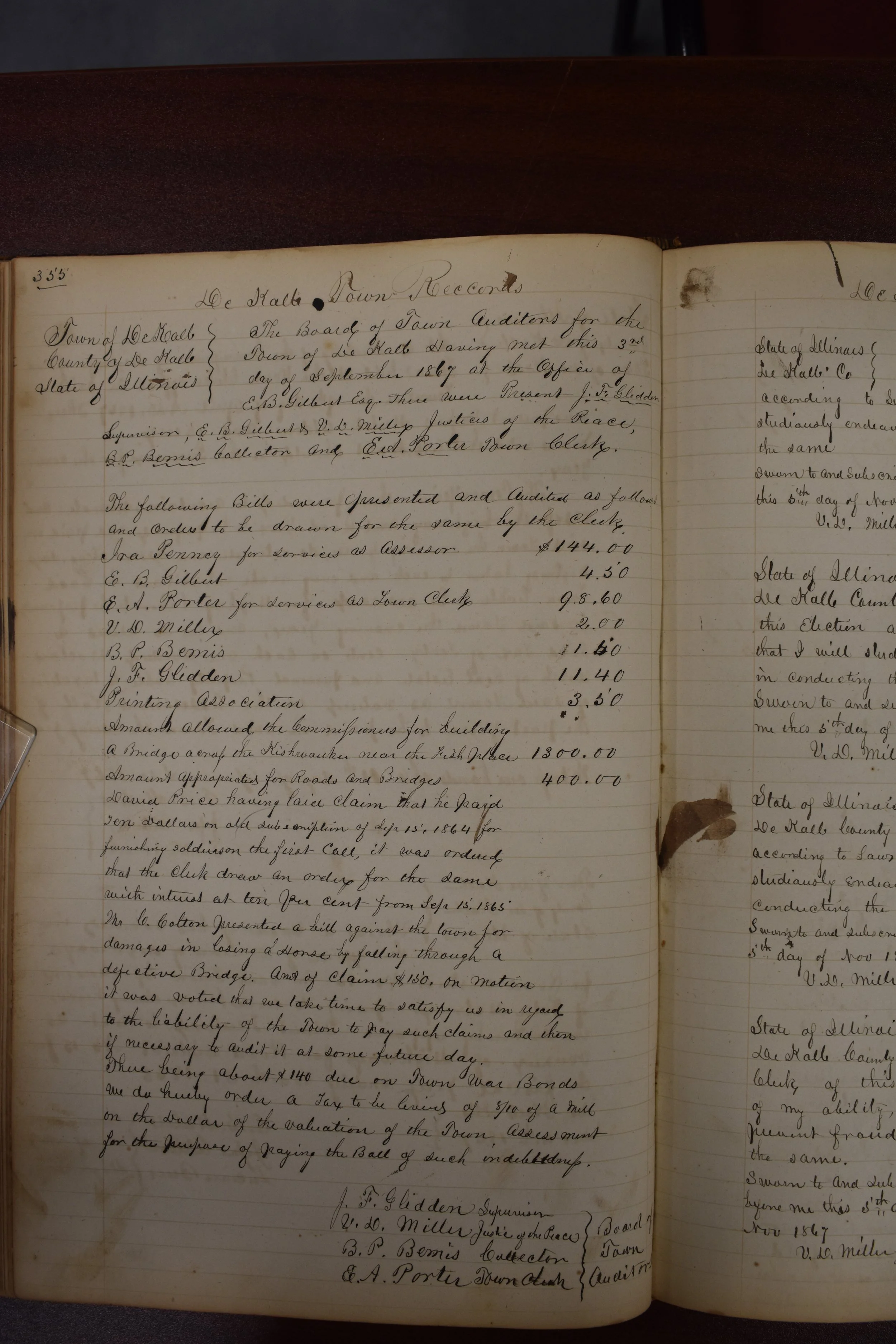 The Board of town Auditors for the town of DeKalb having met this 3rd day of September 1867 at the office of E. B. Gilbert Esq., there were present J. F. Glidden, Supervisor, E. B. Gilbert & V. D. Miller, Justices of the Peace, B. P. Bemis, Collector and E. A. Porter, Town Clerk