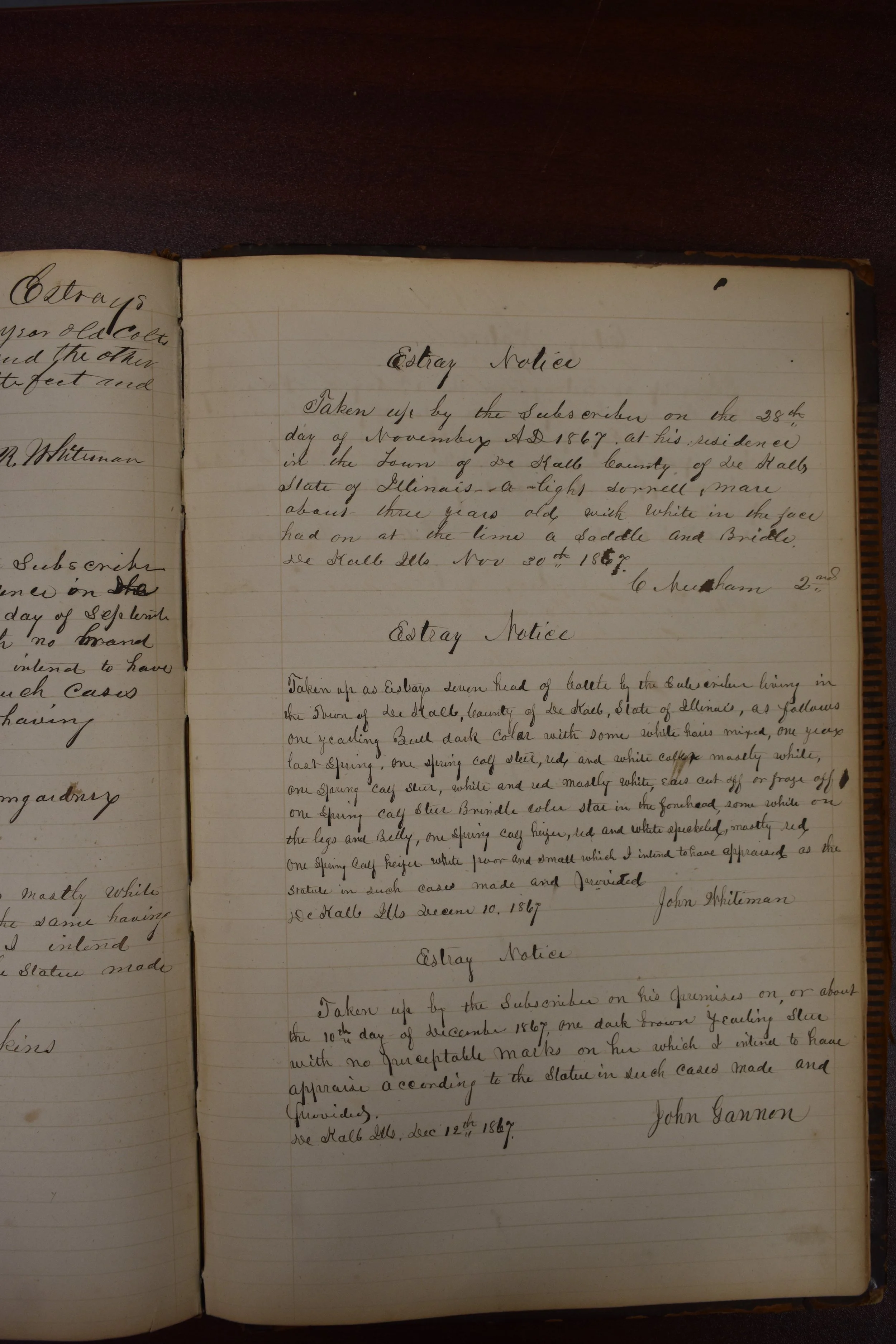Taken up by the subscriber on the 28th day of November A.D. 1867 at his residence in the town of DeKalb, County of DeKalb, State of Illinois a light sorrel mare about three years old with white in the face and on at the time a saddle and bridle.