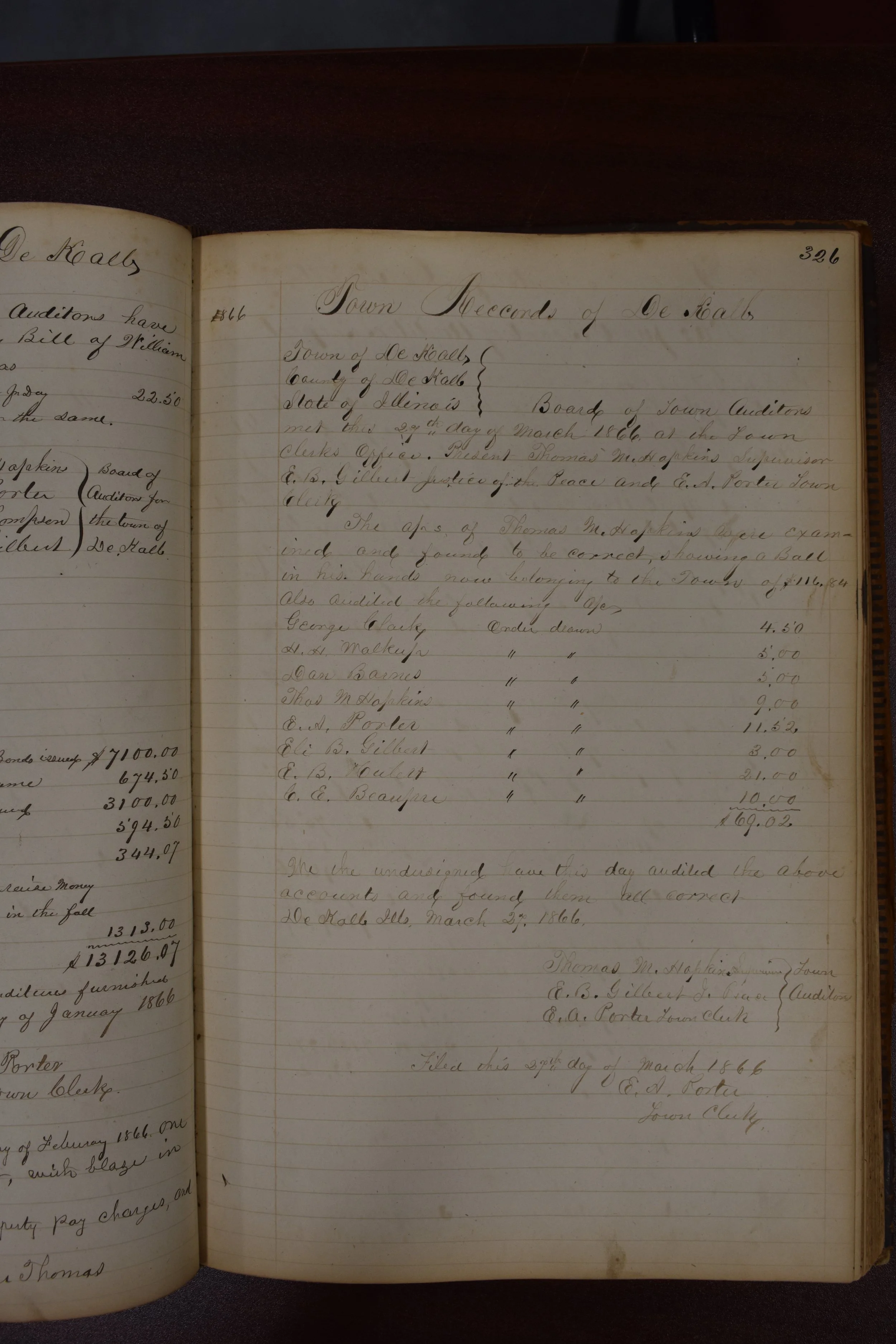 Board of town auditors met this 27th day of Mach 1866 at the town clerk’s office. Present Thomas M. Hopkins, Supervisor, E. B. Gilbert, Justice of the Peace and E. A. Porter, Town Clerk
