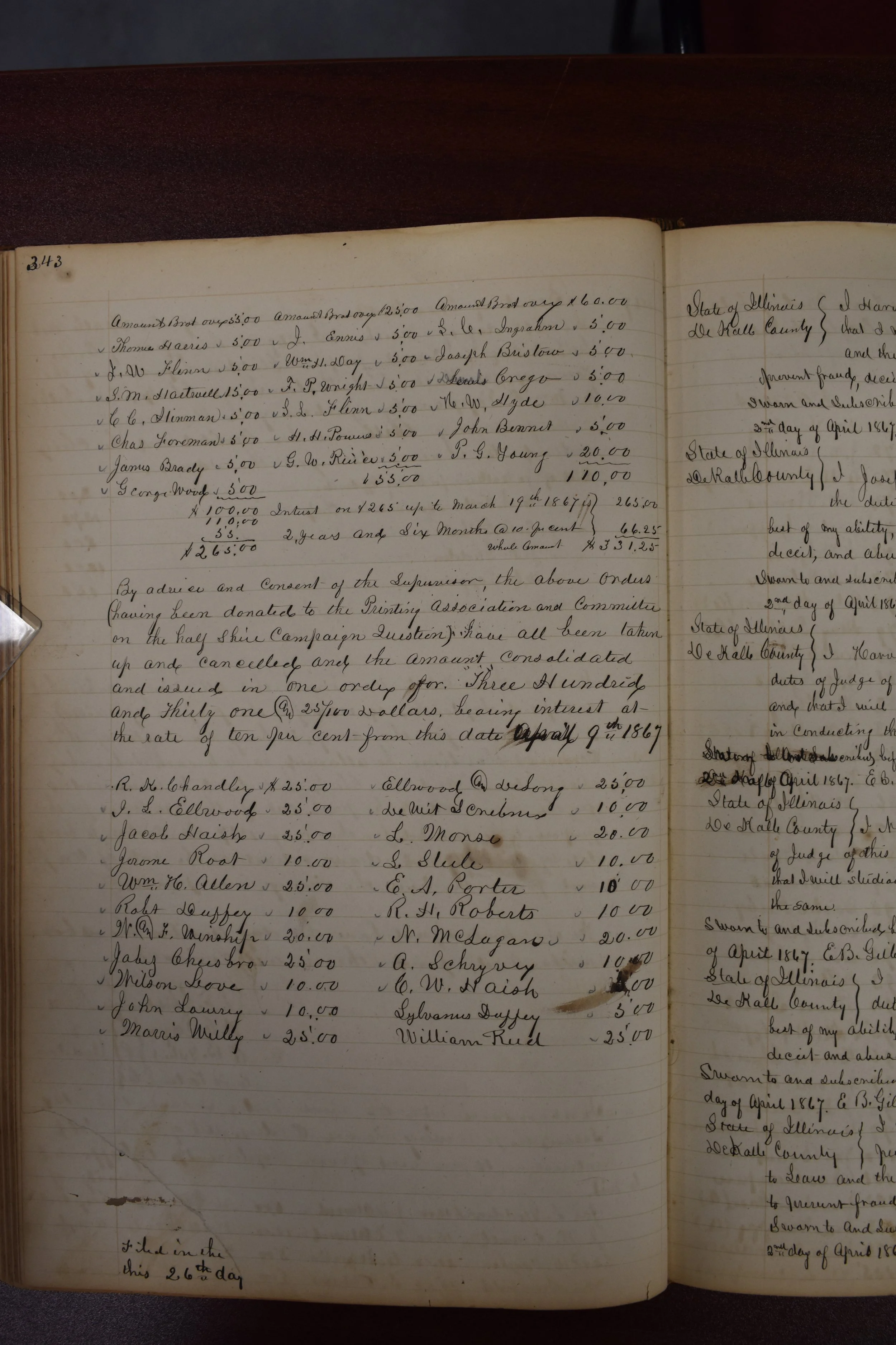By advice and consent of the supervisors the above orders (having been donated to the printing association and committee on the half shire campaign question) have all been taken up and cancelled and the amount consolidated and issued in one order for three hundred and thirty one and 25/100 dollars bearing interest at the rate of ten per cent from this date April 9th 1867