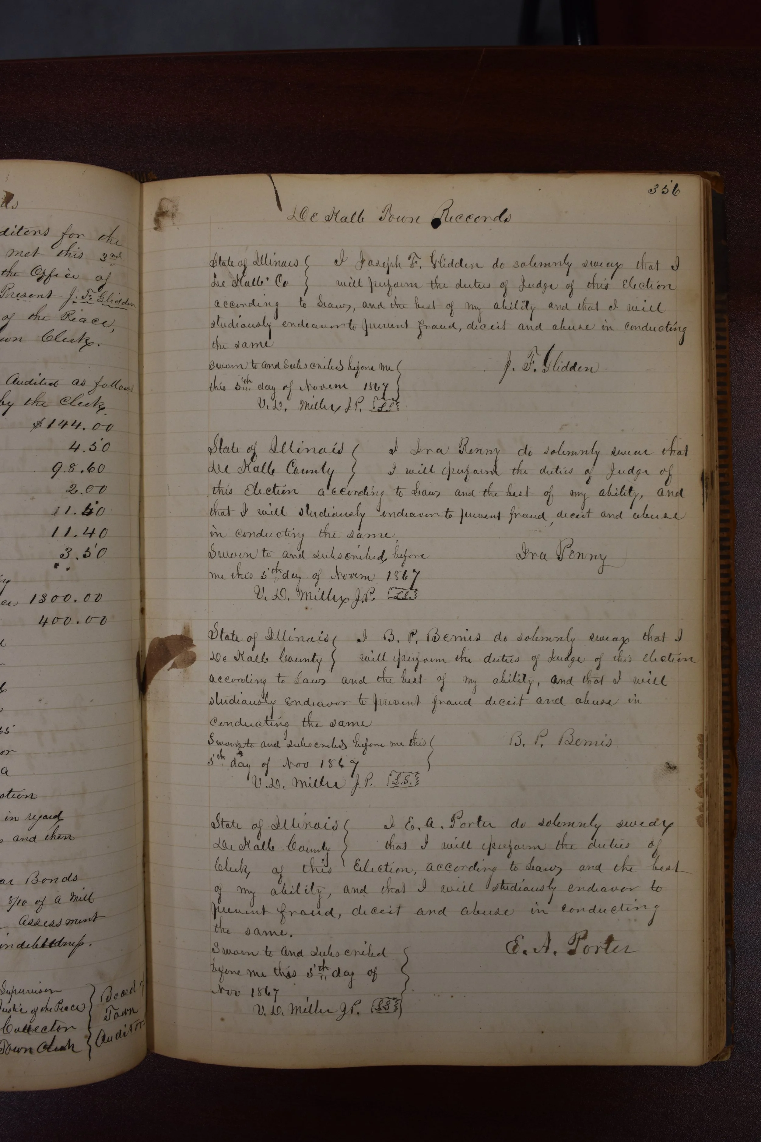 I, Joseph F. Glidden do solemnly swear that I will perform the duties of Judge of this election according to law and the best of my ability and that I will studiously endeavor to prevent fraud, deceit and abuse in conducting the same.