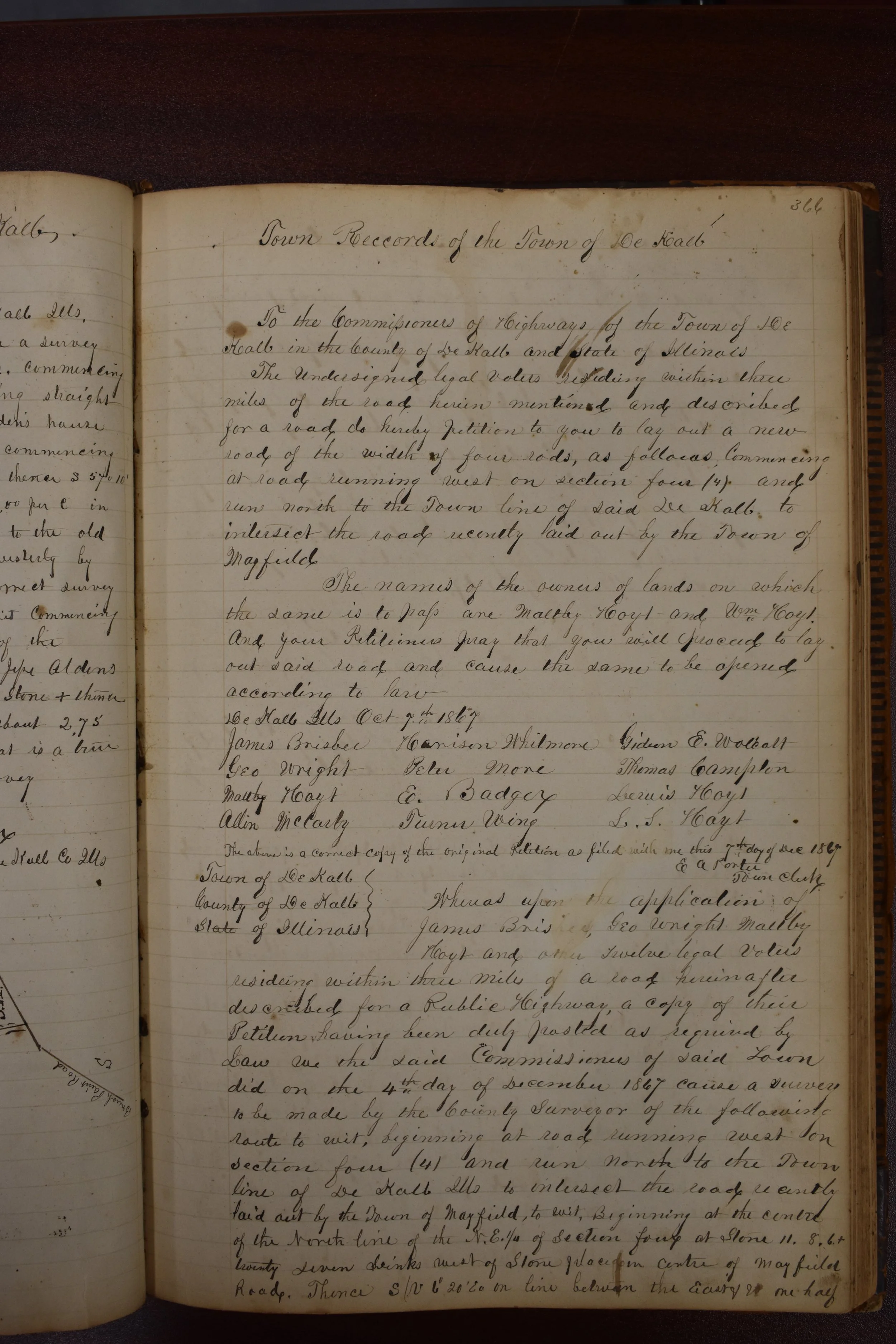 Whereas upon the application of James Brisbee, Geo Wright, Maltby Hoyt and other twelve legal voters residing within three miles of a road herein after described for a public highway a copy of their petition having been duly posted as required by law we the said Commissioners of said town did on the 4th day of December 1867 cause a survey to be made by the county surveyor of the following route to wit, beginning at road running west on section four (4) and run north to thee town line of DeKalb Ills to intersect the road recently laid out by the town of Mayfield, to wit, beginning at the centre of the north line of the N.ED. ¼ of section four at Stone 11.8.6 twenty seven links west of stone placed in center of Mayfield road. Thence S/W 6.20 E on line between the east and one half