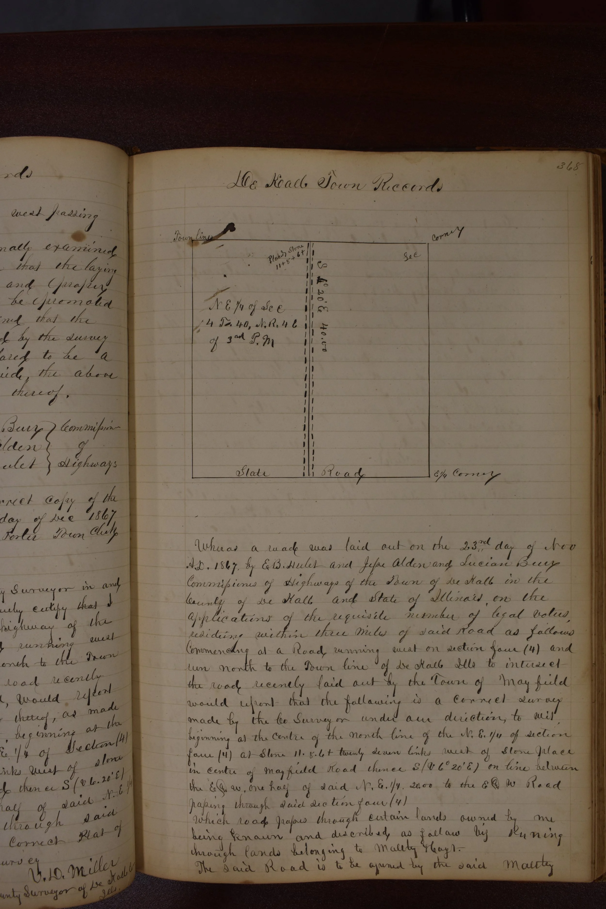 Whereas a road was laid out on the 23rd day of Nov A.D. 1867 by E. B. Hulet and Jesse Alden and Lucian Burr Commissioners of Highways of the town of DeKalb in the county of DeKalb and state of Illinois on the applications of the requisite number of legal voters residing within three miles of said road as follows, commencing at a road running west of section four (4) and run north to the town line of DeKalb Ills to intersect the road recently laid out by the town of Mayfield would upon that the following is a correct survey made by the Co. Surveyor under our direction to wit, beginning at the centre of the north line of the N.E. ¼ of section four (4) at stone 11.8u.6+ twenty seven links west of stone place in centre of Mayfield road thence S(V6.20E) on line between the E and W one half of said N.E. ¼ 20.00 to the E and W road passing through said section four (4), which road passes through certain lands owned by me being known and described as follows viz running through lands belonging to Maltby Hoyt. The said road is to be opened by the said Matltby