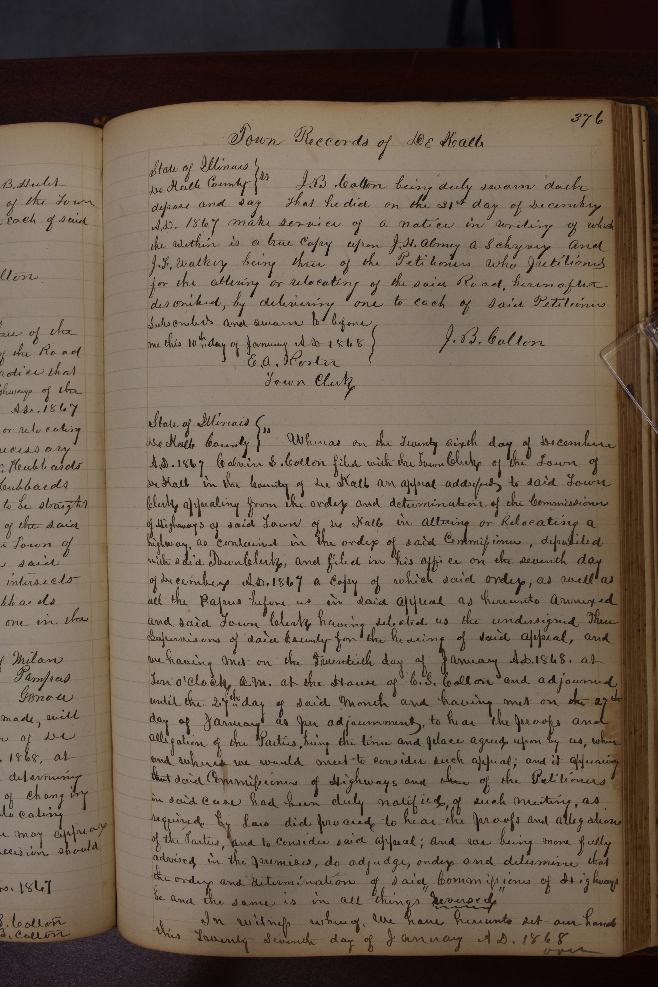 Whereas on the twenty sixth day of December A.D. 1867 Calvin S. Colton filed with the town clerk of the town of DeKalb in the county of DeKalb an appeal addressed to said town clerk appealing from the order and determination of the commissioner of highways of said town of DeKalb in altering or relocating a highway as contained in the order of said commissioner, deposed with said town clerk and filed in his office on the seventh day of December A.D. 1867 a copy of which said order as well as all the papers before us in said appeal as hereunto annexed and said town clerk having selected us the undersigned three supervisors of said county for the hearing of said appeal and we having met on the twentieth day of January A.D. 1868 at ten o’clock A.M. at the house of C. S. Colton and adjourned until the 27th day of said month and having met on the 27thday of January as per adjournment to hear the proof and allegation of the parties being the time and place agreed upon by us where and whereas we would meet to consider such appeal and it appearing that said commissioners of highways and three of the petitioners in said case had been duly notified of such meeting as required by law did proceed to hear the proofs and allegations of the parties and to consider said appeal and we being more fully advised in the premises do adjudge order and determine that the order and determination of said commissioners of highway be and the same is in all things reversed.