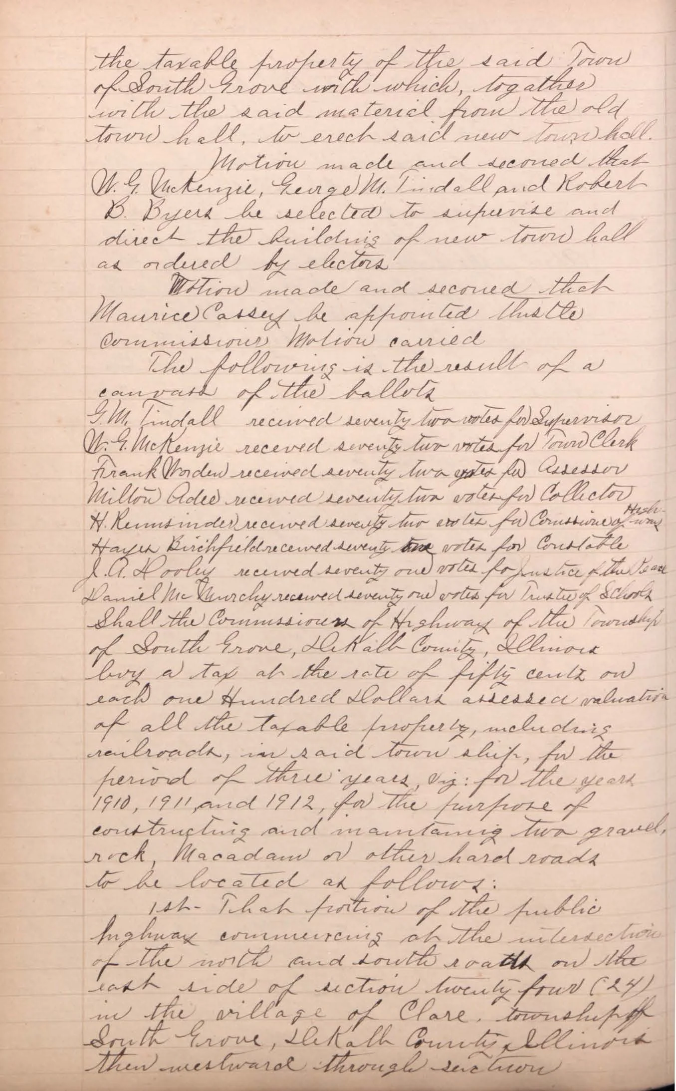 Motion made and seconed [sic] that W. G. McKenzie, George M. Tindall and Robert B. Byers be selected to supervise and direct the building of new town hall as ordered by electors.
